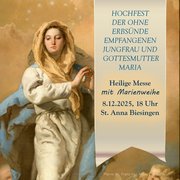 Am Montag, dem 8. Dezember, feiert die katholische Kirche das Hochfest Mariä Empfängnis (lateinisch Conceptio Mariae), also die große Ausnahme in der Menschheitsgeschichte, dass die Gottesmutter ohne Erbsünde empfangen... weiterlesen