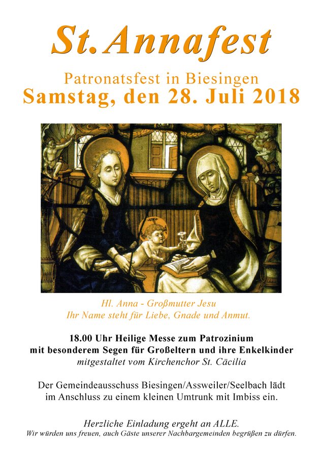 Wir feiern das Fest der hl. Anna um 18.00 Uhr mit Heilige Messe zum Patrozinium und mit besonderem Segen für Großeltern und ihre Enkelkinder. Der Gottesdienst wird vom Kirchenchor St. Cäcilia mitgestaltet.