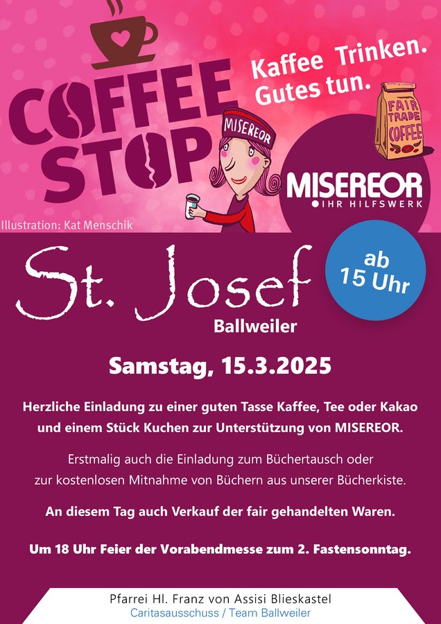 Herzliche Einladung am Samstag, dem 15. März, nach St. Josef Ballweiler zu einer guten Tasse Kaffee, Tee oder Kakao und einem Stück Kuchen zur Unterstützung der Spendenaktion von MISEREOR.