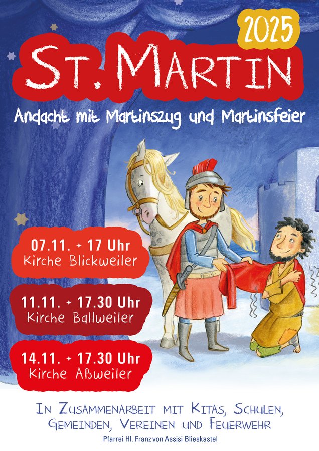 In unserer Pfarrei feiern wir St. Martin – in Zusammenarbeit mit Kitas, Schulen, Gemeinden, Vereinen und Feuerwehr – in Blickweiler am Freitag, dem 7.11., um 17:00 Uhr, in Ballweiler am Dienstag, dem 11.11., um 17:30 Uhr und in Aßweiler am Freitag, dem 14.11., um 17:30 Uhr. Wir laden ganz herzlich dazu ein.