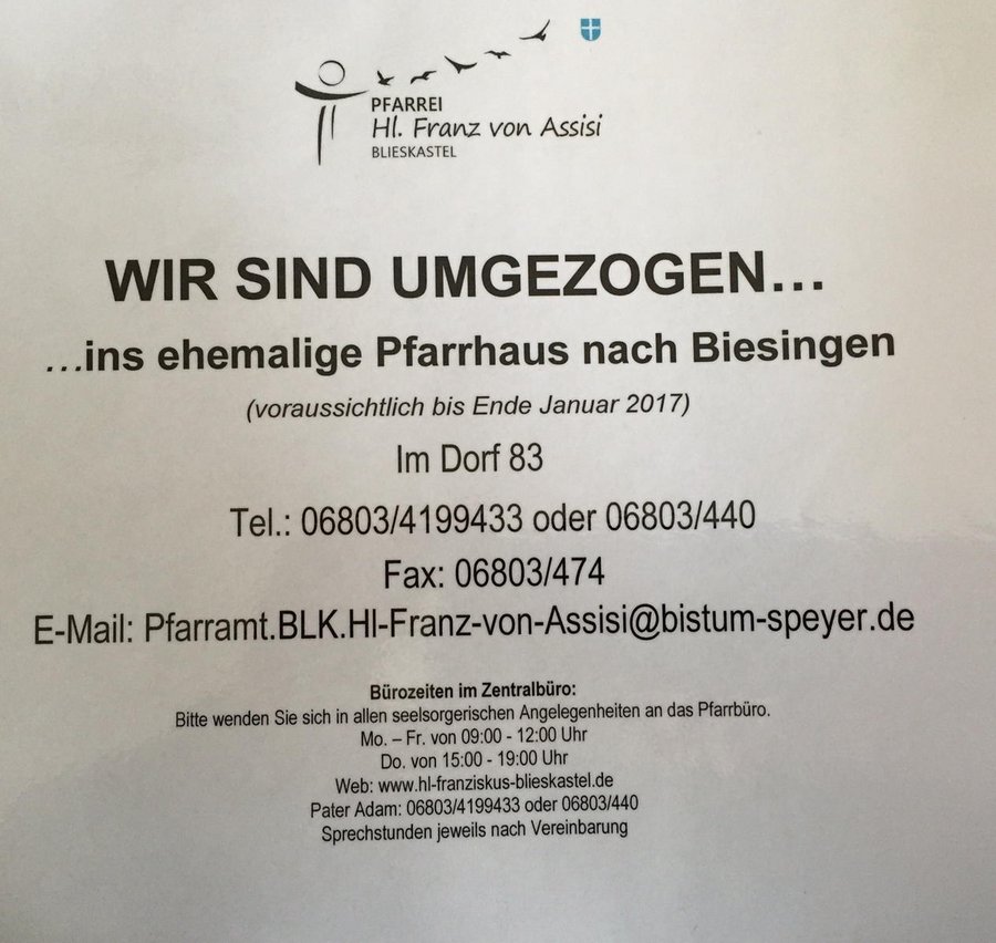 Das zentrale Pfarrbüro ist wegen Umbauarbeiten im Pfarrhaus Blieskastel ab dem 20. Juli 2016, bis voraussichtlich Ende Januar 2017, im ehemaligen Pfarrhaus in Biesingen (Im Dorf 83) zu erreichen.