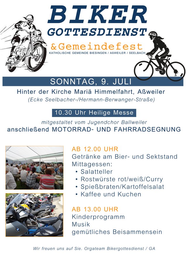 Am Sonntag, den 9. Juli feiert die Gemeinde Biesingen / Aßweiler / Seelbach schon zum vierten Mal den beliebten Bikergottesdienst hinter der Kirche Mariä Himmelfahrt in Aßweiler. Um 10.30 Uhr beginnt die Heilige Messe, mitgestaltet vom Jugendchor St. Josef Ballweiler unter Leitung von Christoph Nicklaus, mit anschließender Segnung aller Motorräder und Fahrräder. Dazu wird die Ecke Seelbacher-/ Hermann-Berwanger-Str. eigens für die Biker gesperrt.
