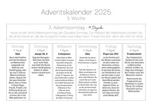 Heute ist der dritte Adventssonntag, der Gaudete-Sonntag. Zur Halbzeit der Adventszeit zünden Sie die dritte Kerze an, die die liturgische Farbe rosa haben kann. Freuen Sie sich, denn der Herr ist nahe!
