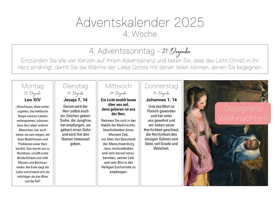 Idee: Verbringen Sie in der Hektik der Weihnachtszeit diese Woche etwas Zeit in Stille und Gebet, vielleicht vor dem Allerheiligsten, um Ihr Herz darauf vorzubereiten, den Herrn zu Weihnachten zu empfangen.