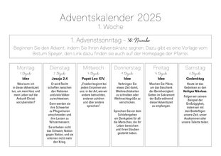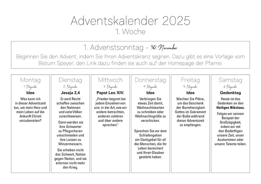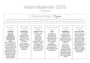 Für die Adventszeit möchten wir ihnen Woche für Woche einen Adventskalender zur Verfügung stellen, den sie sich leicht zuhause ausdrucken können. Um den Kalender druckerfreundlich zu halten ist er ganz einfach gestaltet. Wir wünschen eine segensreiche Adventszeit.
