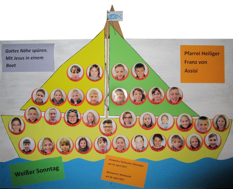Ein herzliches Vergelts’s Gott an Martina Rutz, Judith Welsch, Kathi Werny, Mireille Mathieu-Witt, Simone Keßler und Sandra Wagner, die als Katechetinnen die Kinder auf den Weißen Sonntag mit vorbereitet haben. Unser Dank gilt auch Carola Blum und Susanne Blaumeiser für die Mitfahrt, Mitbetreuung und Beköstigung der Teilnehmer beim Kommunionkinderwochenende in Ramstein.