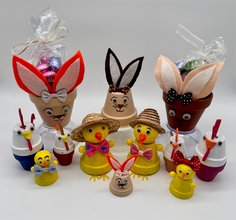 Ebenso kleine Osterhasen, Küken aus Holzkugeln, Tontöpfen oder aus Kunststoffeiern - ein Hingucker auf jeder Fensterbank oder auf dem Kaffeetisch.