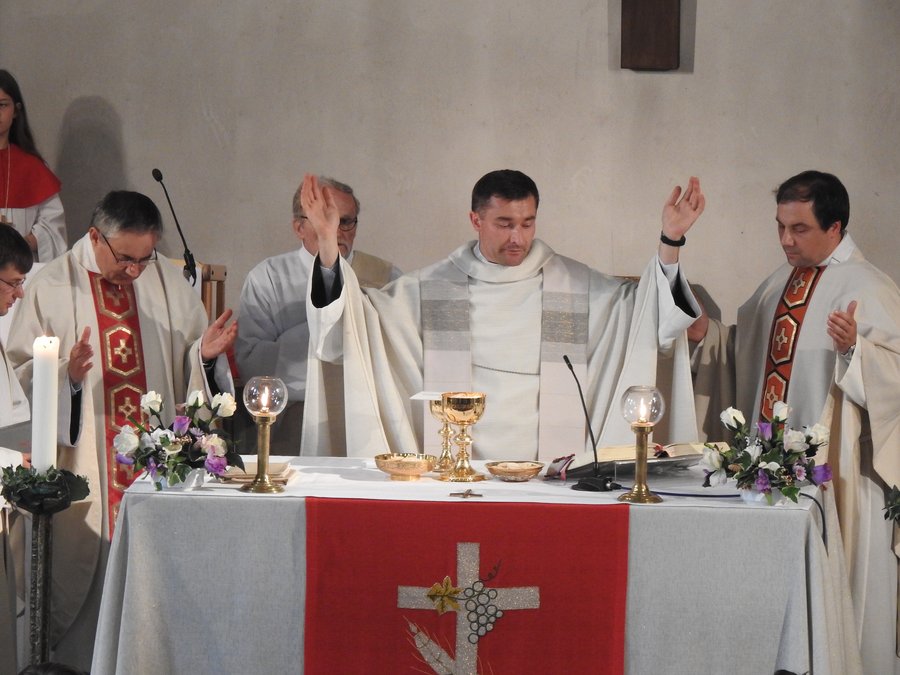 Gerade den Gottesdienst, die Heilige Messe, also die Eucharistie, durfte ich mit Ihnen in der Gnadenkapelle, in der Klosterkirche und in allen Kirchen unserer Pfarrei täglich opfern und feiern! Dafür bin ich vor allem sehr dankbar, dass ich nicht allein, sondern mit der Gemeinde dieses Dankopfer sooft erlebten durfte! Ja zum Dank gehört die Eucharistie, sie heißt übersetzt Danksagung. Mit der Feier der Eucharistie sagen wir Dank. Wir begegnen in der Eucharistie Jesus. Wir glauben ihm und seiner Liebe. Wir vertrauen auf seine Heilsbotschaft. Wir stärken uns mit der Kraft Gottes. Das Hochgebet der Eucharistie beginnt einer großen Aufforderung zum Dank: Erhebet die Herzen. – Wir haben sie beim Herrn. – Lasset uns danken dem Herrn, unserm Gott. – Das ist würdig und recht.