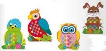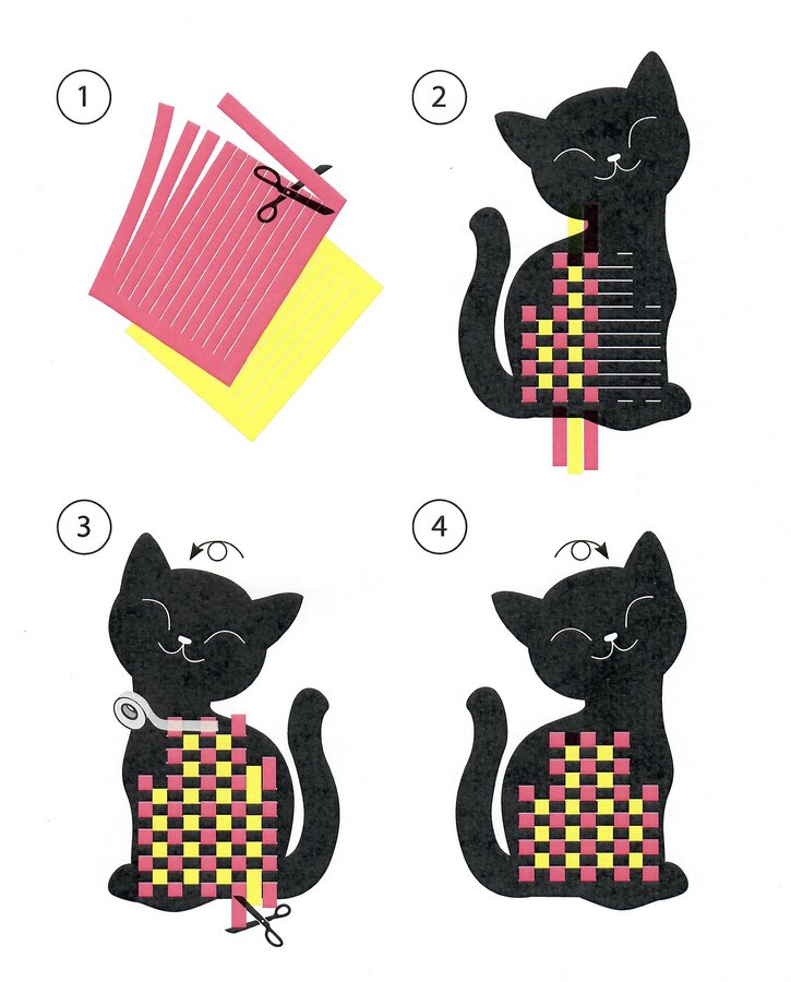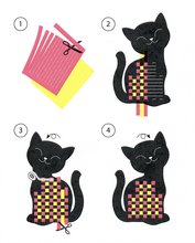 Aus verschiedenen Motiven in A4 Größe, welche schon vorgeschnitten sind und somit die Faltstreifen einfach durchgeschoben werden, entstehen kleine schöne Bilder. Oder man schneidet aus Tonpapier Streifen aus und flechtet diese in vorbereiteten Tonkarton.