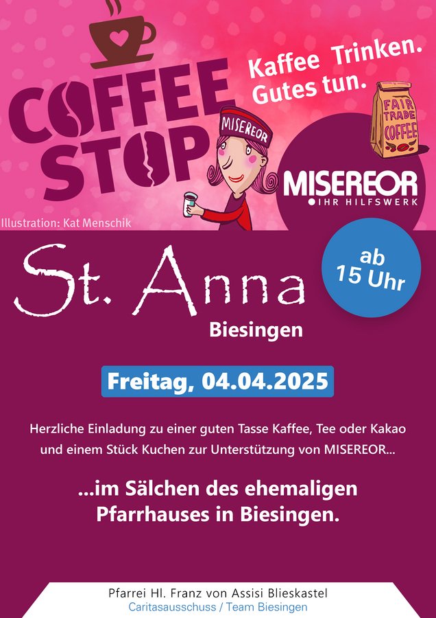 Herzliche Einladung am Freitag, dem 4. April, ab 15 Uhr, ins Sälchen des ehemaligen Pfarrhauses in Biesingen zu einer guten Tasse Kaffee, Tee oder Kakao und einem Stück Kuchen zur Unterstützung von MISEREOR...